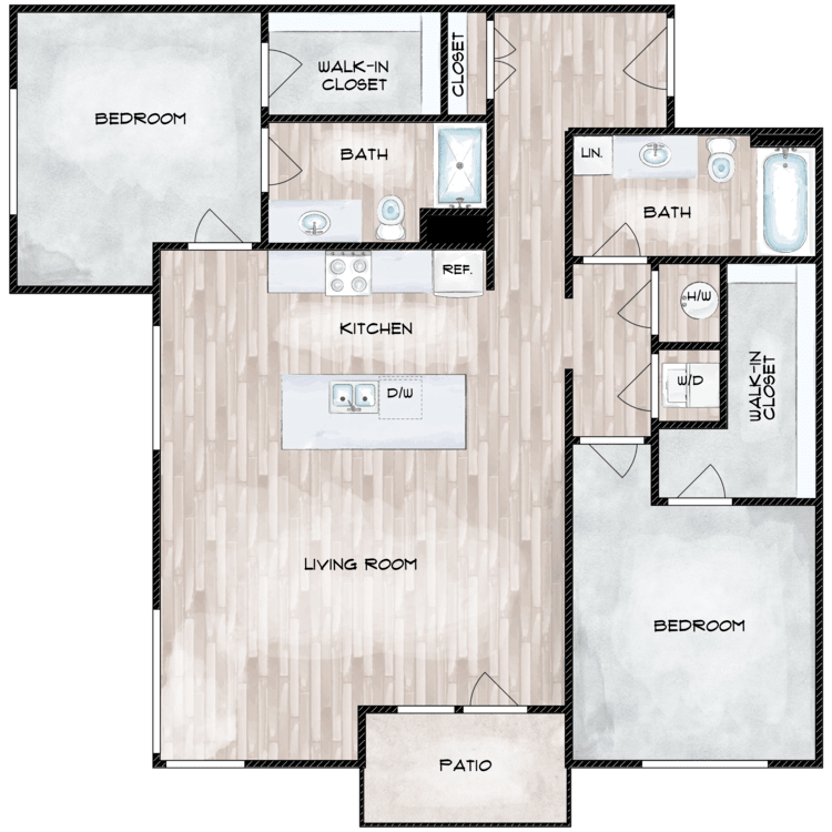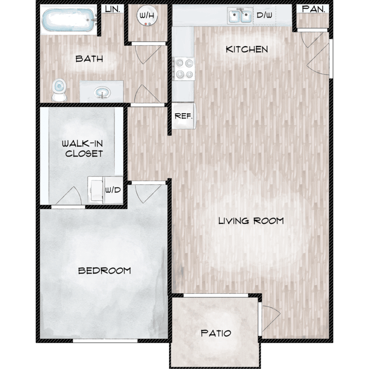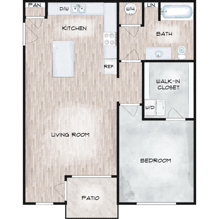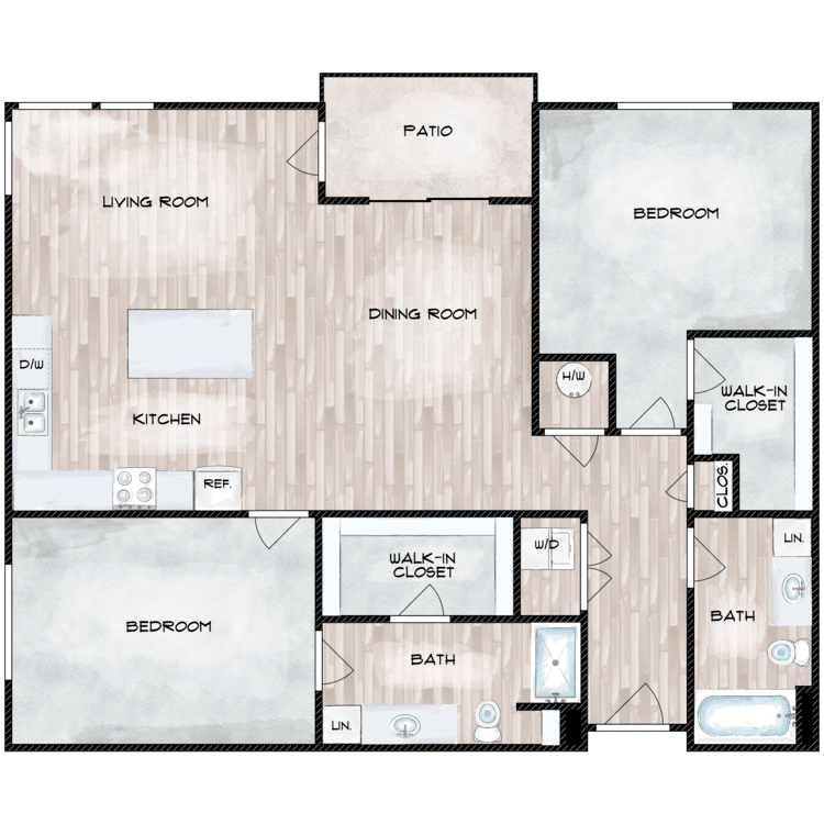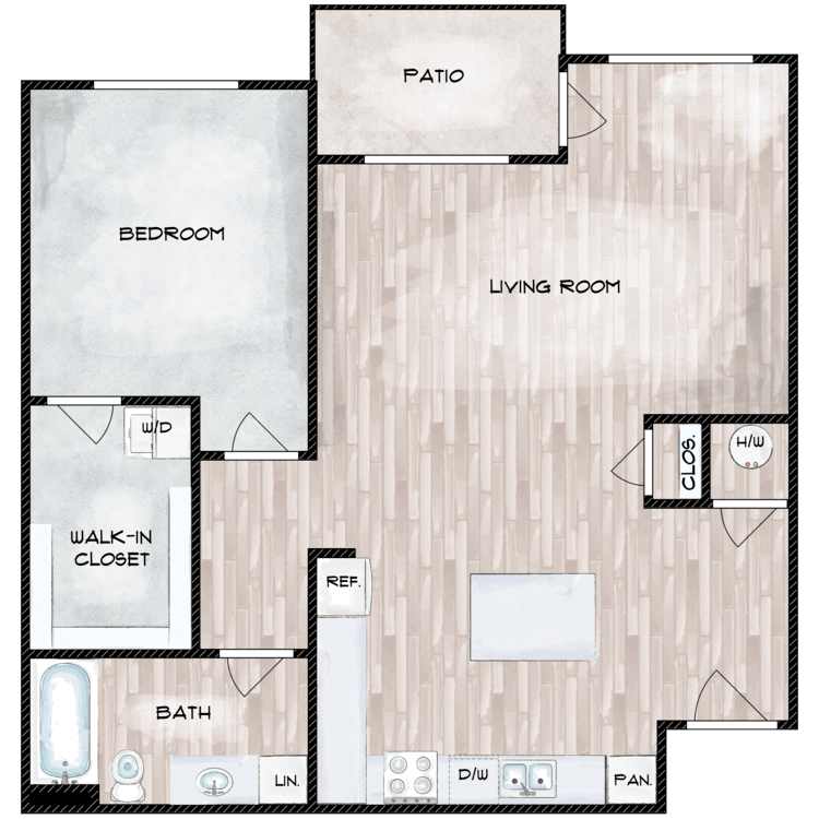 Our studio, one, and two-bedroom apartments for rent are designed with the amenities you deserve. We offer spacious layouts with designer kitchens, central heating and air, in-unit washers and dryers, wood look flooring, walk-in closets, and extra storage. Each residence also has an all-electric kitchen with stainless steel appliances, including dishwasher, microwave, oven/range, and refrigerator. A balcony or patio increases your living space and provides a relaxing space to unwind.